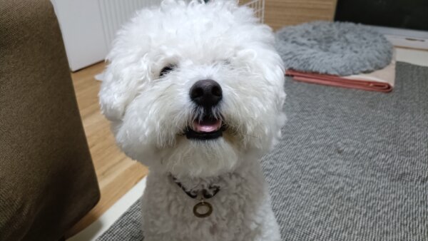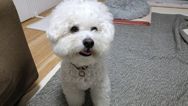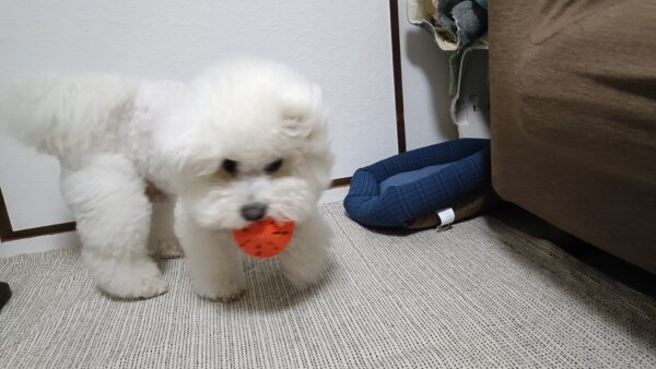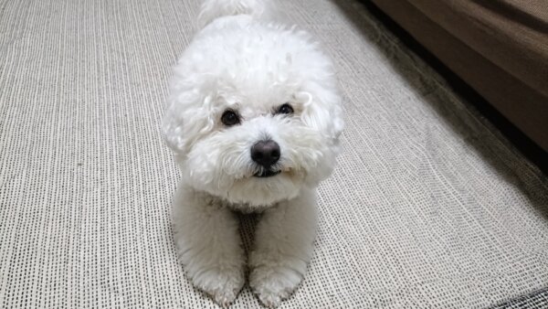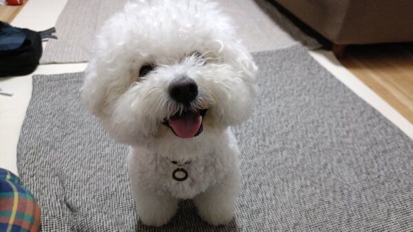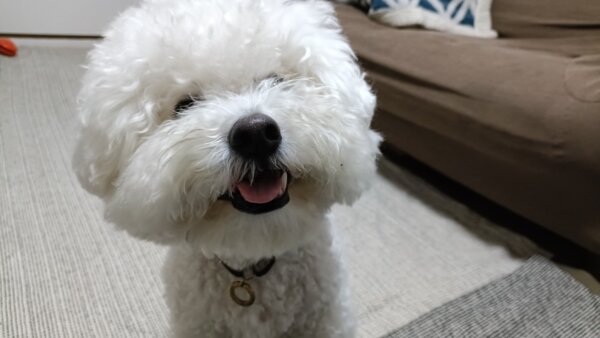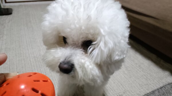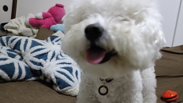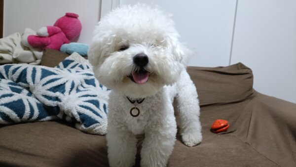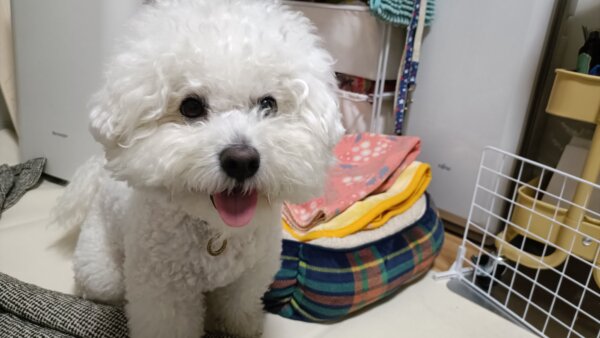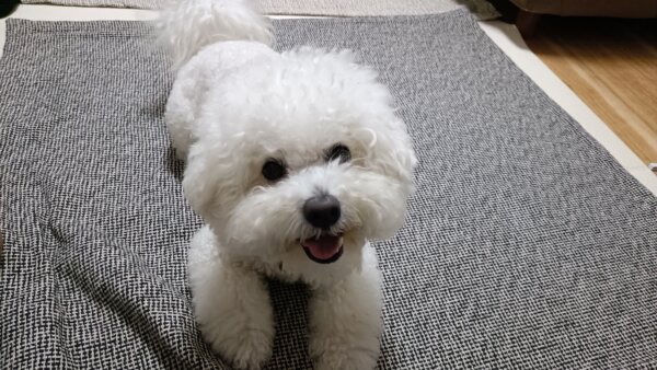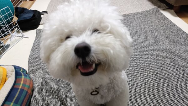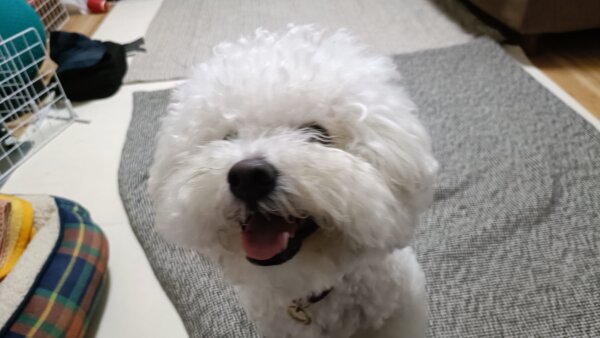 先日シッティングにお伺いさせていただきました、ビションフリーゼのはなまるくんです😊