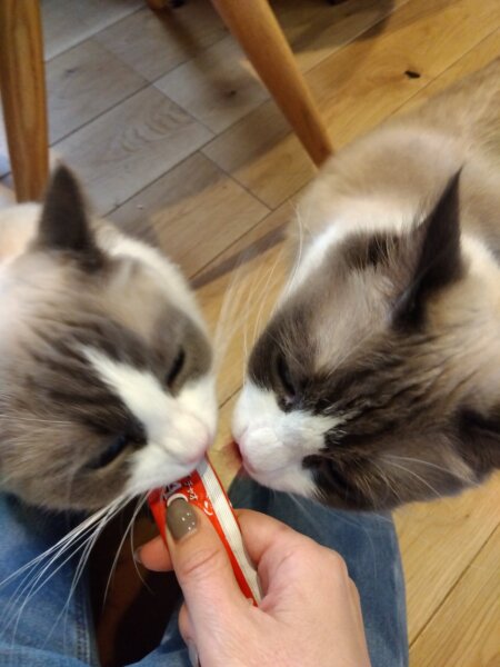 お楽しみのちゅーるタイムでは、仲良く半分こしてペロリ😋