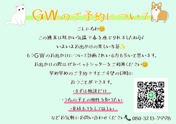 こんにちは😊 今週土曜日、日曜日は暖かい日が続いて春を感じられました🌸 いよいよお出かけも楽しくなる季節✨ 再度のお知らせになりますがGWのご予約についてのお知らせです- ̗̀📣 『湘南台・藤沢・上大岡駅周辺・戸塚』でペットシッターをお探しの方、GWまだ予約に空きがございます🐶🐱 わんちゃん、猫ちゃんのお留守番はお任せください✨